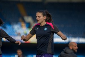 Isobel Goodwin (23 London City) warming up ahead of the FA Womens Super League game between Chelsea and London City Lionesses at Stamford Bridge, London.