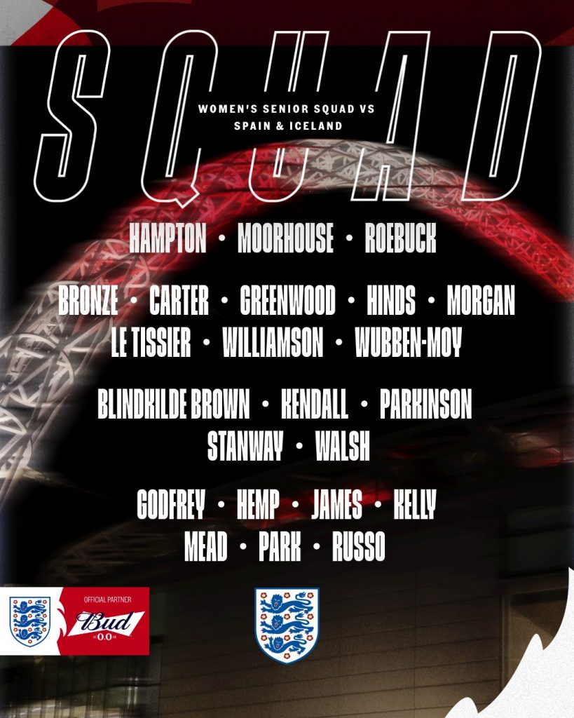 Goalkeepers: Hannah Hampton (Chelsea), Anna Moorhouse (Orlando Pride), Ellie Roebuck (Aston Villa)